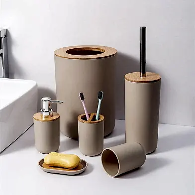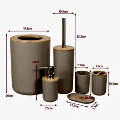 Şık bir banyo seti ; tuvalet fırçası, çöp kutusu, sabunluk, sabunluk, diş fırçası tutacağı ve diş fırçası kabı içermektedir .