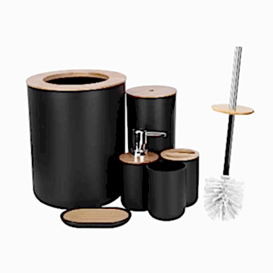 Şık bir banyo seti ; tuvalet fırçası, çöp kutusu, sabunluk, sabunluk, diş fırçası tutacağı ve diş fırçası kabı içermektedir .