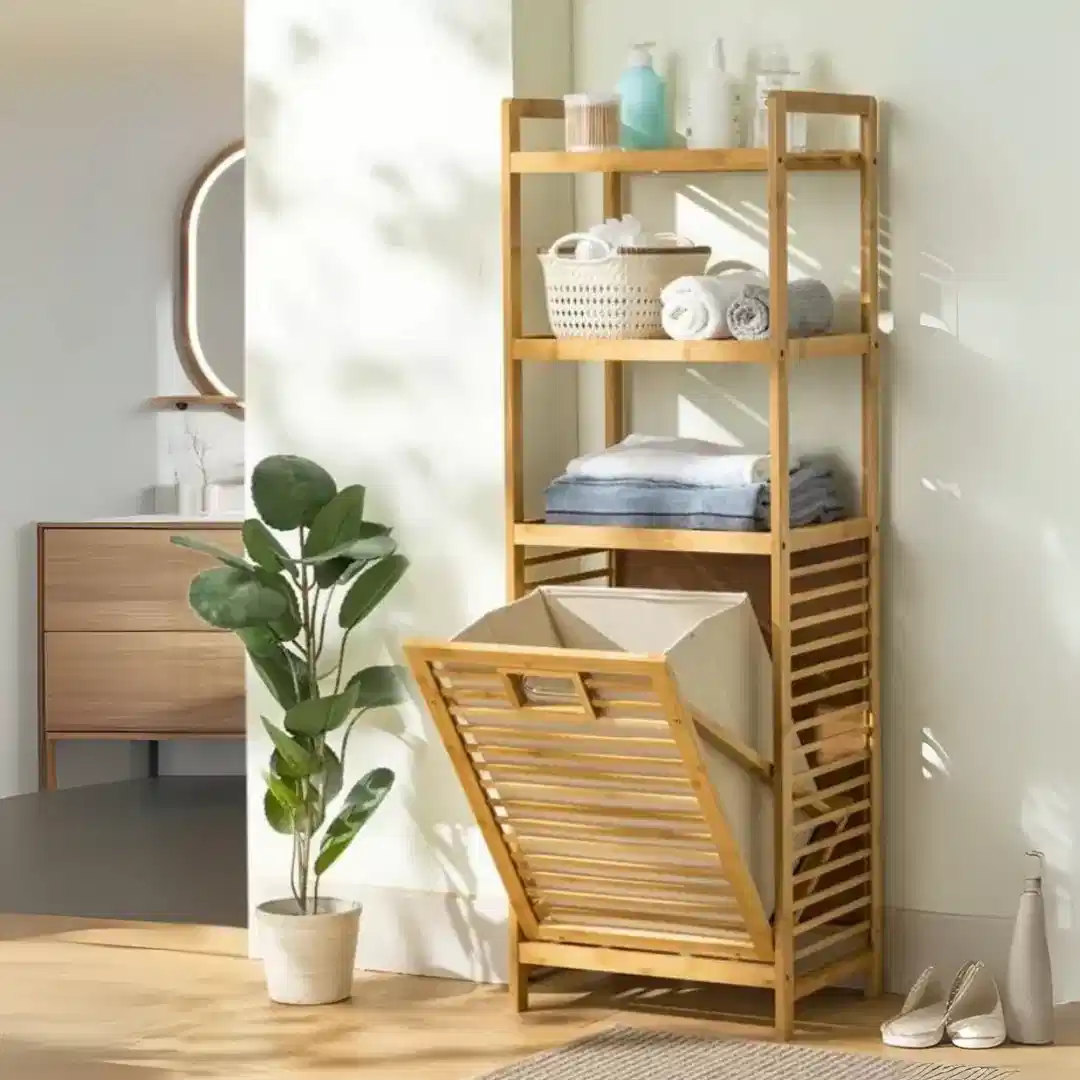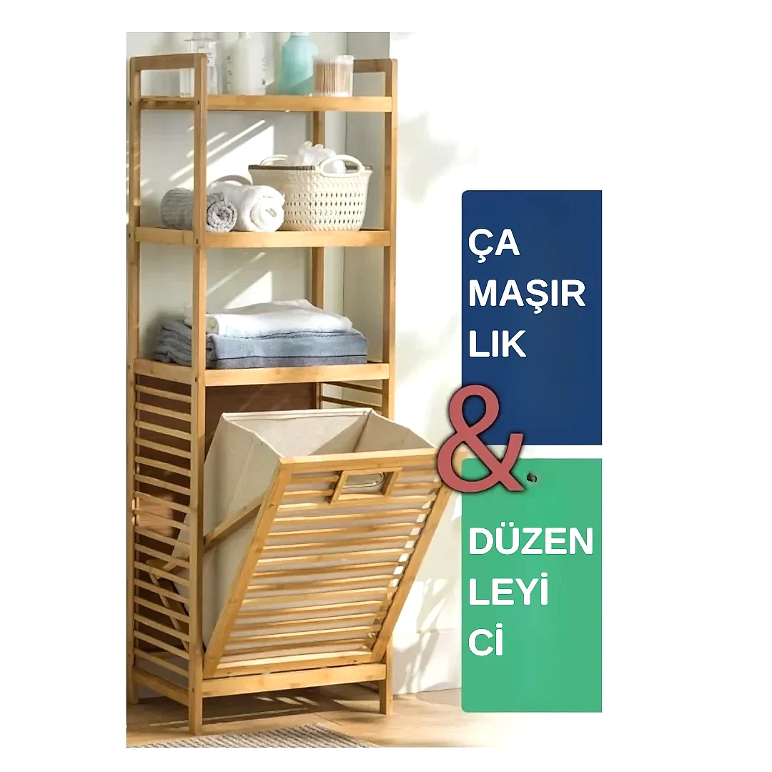 Doğal bambu raflar, bambu iskelet, 3 katlı raf sistemi ve kumaş kirli sepeti mevcuttur.