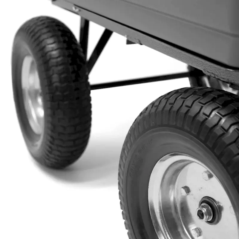Bu bahçe römorku, 200 kg yük kapasitesine ve devrilme özelliğine sahip, sağlam, darbeye ve paslanmaya dayanıklı polikarbonat bir hazneye sahiptir. Çok amaçlı sapı sayesinde römork itilebilir, çekilebilir veya çekme kancası takılı bir çim biçme traktörüne bile bağlanabilir.
